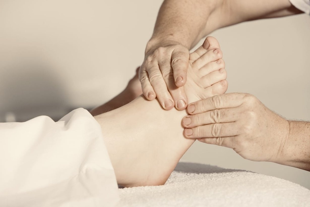 Behandlung der Faszien in Füßen, Unterschenkeln und Adduktoren. Das Knie wird mobilisiert und im Bereich des Beckens (Os Ischii) weitergearbeitet. Zusätzlich werden verklebte Faszienschichten im Oberkörper gelöst.